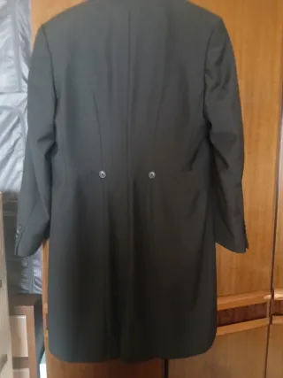 Elegante chaqueta de frac, ideal para eventos formales. Se encuentra en perfecto estado, como nueva. - Diseño clásico de frac. - Cierre de un botón. - Forro interior de satén. - Tiene el forro un poco descolorido por debajo,por el sol del escaparate seguramente, pero puesto no se ve. Por eso lo dejo más barato. Está sin estrenar