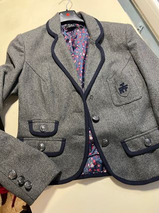 Chaqueta de corte clásico con un diseño elegante. - Ribete de contraste en color azul marino. - Forro interior estampado. - Bolsillos con solapa y botón. - Botones frontales y en puños.