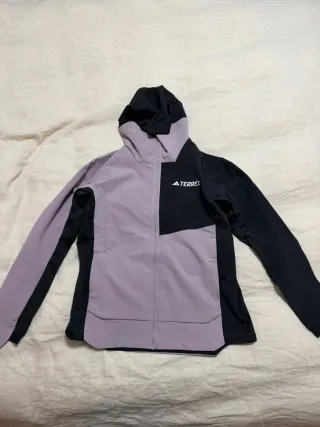 Chaqueta deportiva Adidas Terrex con un diseño moderno y bicolor. - Paneles en color negro y morado. - Capucha integrada. - Cierre de cremallera frontal.