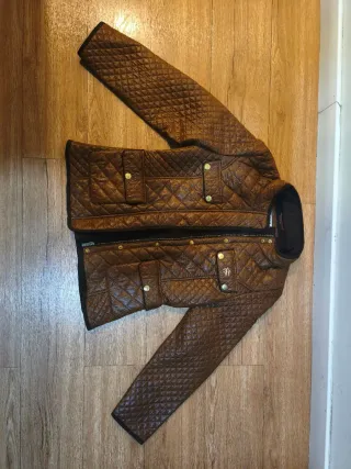 Chaqueta con forro a cuadros de la marca Pumarsan.usada dos veces - Diseño clásico. - Detalle de etiqueta con el nombre de la marca y MADRID. - Forro interior con estampado de cuadros en tonos beige, rojo y negro.