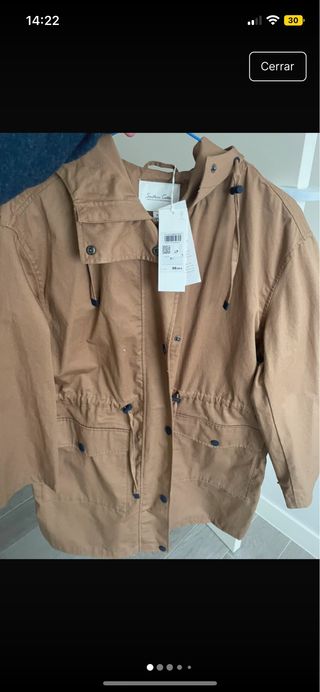 Chaqueta cortavientos de la marca Purificación García en tono taupé. Es una prenda ligera y funcional. - Diseño con cuello redondo. - Cierre de cremallera frontal y botones - Cintura ajustable con cordón. - Bolsillos delanteros con solapa y botón. - Detalle de botones decorativos en la parte superior. Está en perfecto estado salvo por un ínfimo agujerito en el bajo ( última foto) Apta también para talla M