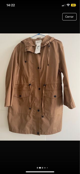 Chaqueta estilo gabardina en tono beige. - Diseño con capucha. - Cintura ajustable con cordón. - Bolsillos frontales con solapa.