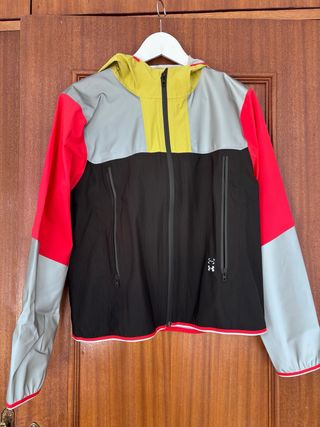 Chaqueta con un estampado llamativo en tonos morados, rojos y turquesas. Ideal para actividades al aire libre. - Diseño con capucha ajustable - Cremallera frontal. - Bolsillos con cremallera. - Bolsillos interiores. - Sin estrenar con la etiqueta. Solo venta en persona.