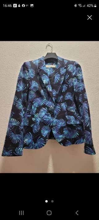 Chaqueta con un llamativo estampado de hojas en tonos azules y fondo negro. - Diseño de hojas tropicales. - Corte entallado. - Cierre de un botón.