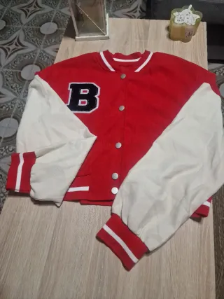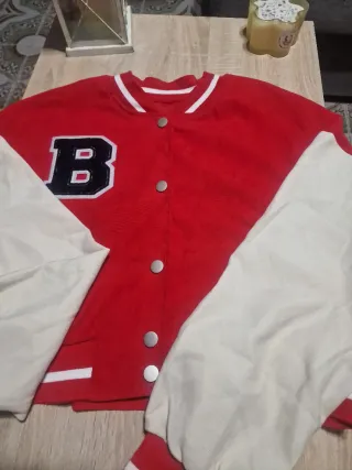 Chaqueta estilo universitario con mangas de diferente color. - Diseño con letra B bordada en el pecho. - Cierre de botones a presión. - Puños y cuello elásticos con detalles de rayas.