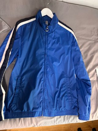 Chaqueta ligera con un estilo vintage y detalles deportivos. - Diseño con rayas blancas y negras en las mangas. - Cuello alto. - Cierre de cremallera frontal. - Bolsillos laterales.