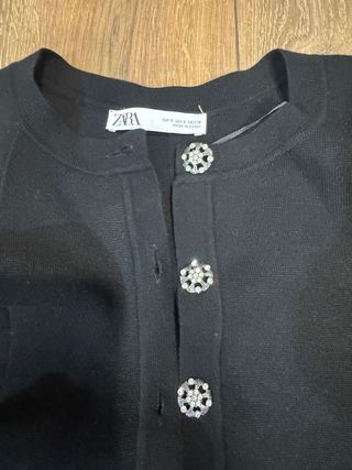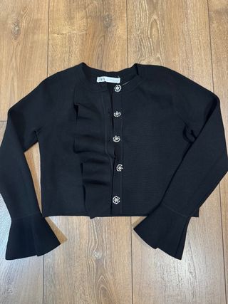 Chaqueta de punto con botones joya. - Diseño cropped. - Mangas acampanadas. - Cierre de botones frontales. - Detalle de volantes.
