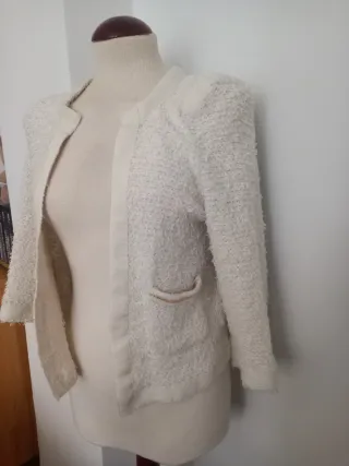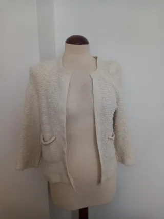 Chaqueta de punto de la marca Sfera, de color blanco y sin forro interior. Presenta un diseño abierto y bolsillos decorativos. - Tejido texturizado. - Abertura frontal. - Bolsillos con detalle. - Mangas tres cuartos.