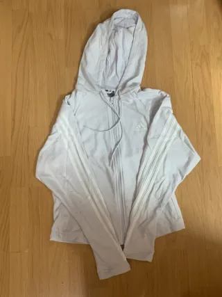 Chaqueta deportiva Adidas con capucha y cremallera completa. Presenta el icónico diseño de tres rayas en las mangas. - Diseño con capucha. - Cierre de cremallera. - Tres rayas distintivas en las mangas.