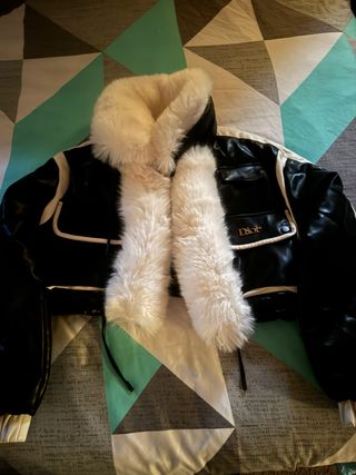 Chaqueta de polipiel con detalles en blanco y un llamativo cuello de pelo sintético. - Diseño cropped. - Cierre de cremallera. - Bolsillos frontales con solapa. -