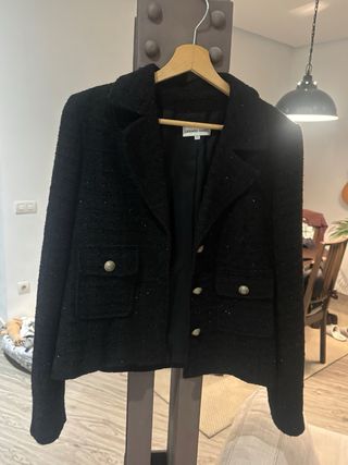 Elegante chaqueta de tweed en color negro. Un básico sofisticado para cualquier ocasión. - Diseño con solapas clásicas. - Cierre de botones. - Dos bolsillos frontales con solapa y botón.