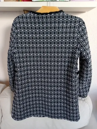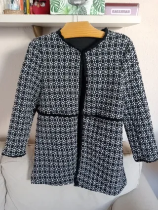 Elegante chaqueta de corte clásico, inspirada en el estilo Chanel. Perfecta para añadir un toque sofisticado a cualquier atuendo. Talla S. - Tiene un único cierre en el cuello. - Diseño con estampado geométrico en blanco y negro. - Acabado con ribete negro. - Manga larga.