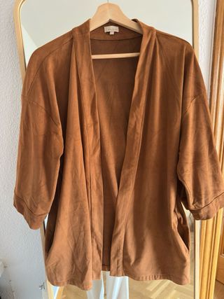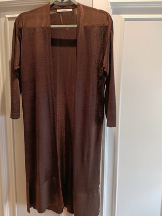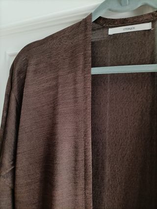 Chaqueta larga de la marca Uterqüe en color marrón. Su tejido es ligero y con una textura sutil. - Diseño abierto. - Manga larga. - Corte recto. Medidas/ hombros 50cms, manga 41- sisa 48-largo 1metro