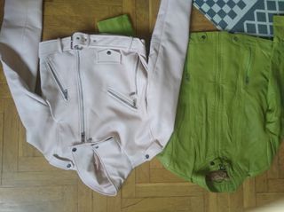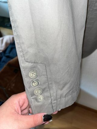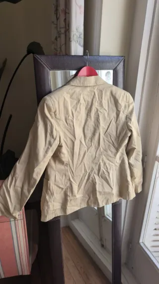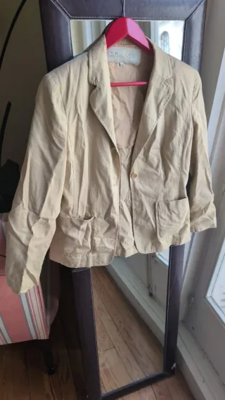 Pack de dos chaquetas de la marca Zara. Una de color beige y otra dorada. - Chaqueta beige con bolsillos delanteros con etiqueta. - Chaqueta dorada con botones y tejido brillante. El pack: 35€ La chaqueta con etiqueta: 25€ La dorada: 15€