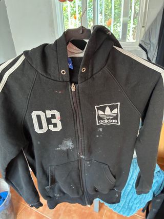 Chaqueta deportiva Adidas con diseño clásico. - Cierre completo con cremallera. - Capucha integrada. - Rayas distintivas en las mangas. - Número 03 estampado en el pecho. - Logo de Adidas en el pecho.