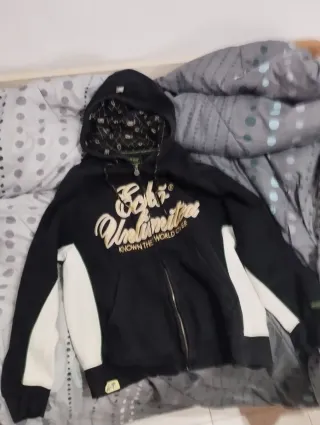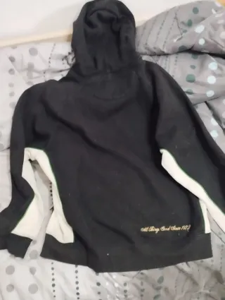 Chaqueta estilo bomber con capucha y cremallera. - Mangas de color gris. - Cuerpo principal de color negro. - Puños y cintura con detalles de rayas. Chaqueta polar tipo bomber college con diseño moderno y cómodo. De Pepperts. Talla 10/12 - Cuerpo principal en color negro. - Mangas en color gris jaspeado. - Puños y bajo con detalles de rayas. - Cierre completo con cremallera. - Capucha integrada y 2 bolsillos Medidas : Largo 58, mangas 51 hombros 48, sisa 50 #pepperts #bomber #chaquetacollege