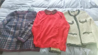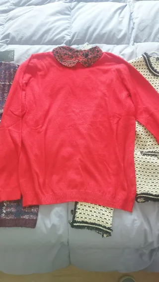Jerseys otoño invierno nuevos con etiqueta talla M, varios estilos y precios. Individualmente: - Jersey rojo fino con cuello de blusa De kiabi. 7 € - Jersey de cuadros escoceses. Es muy calentito y ancho. De Sfera. 10 € - Chaqueta twed blanca y negra de Sfera. 10 €. LOS 3 POR 25