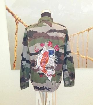 Chaqueta de camuflaje con un diseño único de pez Koi japonés en la espalda. Es una prenda de estilo militar con un toque artístico. - Material: 100% algodón. - Diseño: Estampado de camuflaje y bordado de pez Koi con caracteres japoneses. - Cierre: Botones frontales. - Bolsillos: Múltiples bolsillos frontales. ✨ Estado: nueva e impecable 🧵Composición Premium: 100% algodón 🌈 Color: caqui y negro 📏 Talla etiqueta: S oversize recomiendo talla L 📐 Medidas: Ancho de hombros: 44 cm Axila a axila (medida plana): 57 cm Largo desde el cuello: 70 cm Largo de manga: 61 cm 🚛 Envíos rápidos 24/48h.
