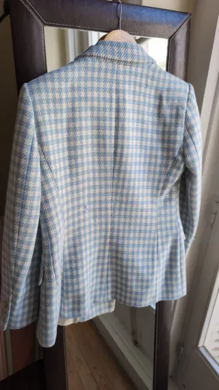 Chaqueta de Zara con un clásico estampado de pata de gallo en tonos azul y blsnco. Un diseño elegante y versátil. - Doble botonadura. - Tapetas frontales. - Cuello solapa. Medidas: Largo: 68cm Hombros 41 cm axilas: 44 cm