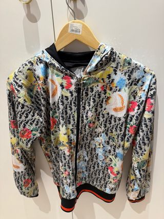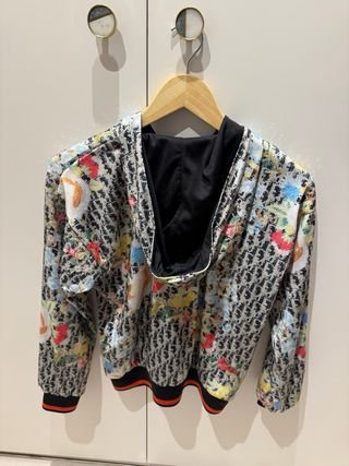 Chaqueta con capucha de la marca Dior. Presenta un diseño vibrante y llamativo. - Estampado floral sobre fondo con logo. - Cierre de cremallera frontal. - Puños y bajo elásticos.
