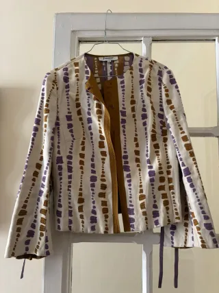 Chaqueta con un diseño original y llamativo. - Estampado de rayas verticales en tonos morados y marrones. - Detalle frontal en tejido marrón. - Corte moderno y favorecedor. Medidas en cm: Hombro 41 Sisa 47 Largo 48