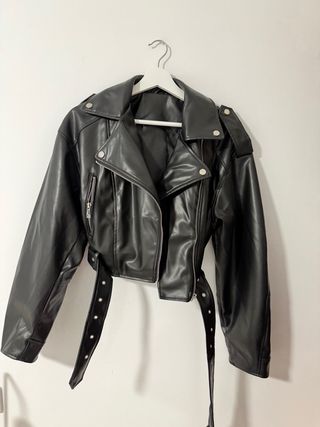 Chaqueta de polipiel con un diseño moderno y versátil. - Corte cropped. - Bolsillos delanteros. - Cuello solapa. Talla única pero grande para una xs