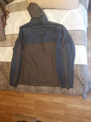 Chaqueta cortavientos con capucha, ideal para actividades al aire libre. Diseño bicolor que combina azul y marrón. - Cierre de cremallera frontal. - Capucha ajustable. - Puños elásticos.