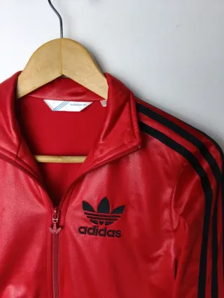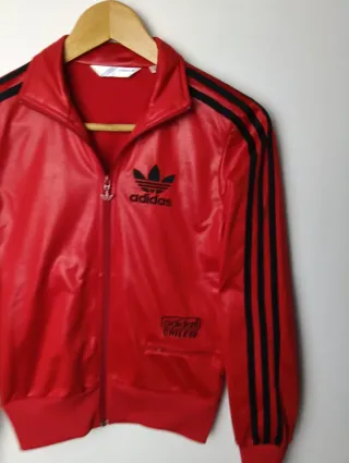 Chaqueta deportiva Adidas Chile 62 con acabado efecto mojado. - Color rojo brillante - Detalles de las tres franjas negras en las mangas. - Logo de Adidas bordado en negro en el pecho. 👉 ADIDAS chaqueta con cremallera modelo Chile 62 efecto mojado. ©️ Artículo original. 🏷️ Talla en etiqueta: 32 (revisar medidas). 📏 MEDIDAS ↕️ 54 cms largo ↔️ 40 cms sisa ↕️ 68 cms largo de manga • Muy buen estado 🔎 • Prenda lavada y planchada 🧽 • Rojo y negro 🎨 • Poliéster 🔬 ✈️ Envíos rápidos y protegidos. ⚠️ No acepto devoluciones: todas las prendas de segunda mano pueden tener signos de uso.
