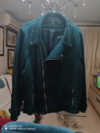 Chaqueta estilo motero de la marca October. - Color verde oscuro. - Detalle de tachuelas plateadas en cuello, solapas y bolsillos. - Cierre de cremallera asimétrica. - Bolsillos frontales con cremallera.