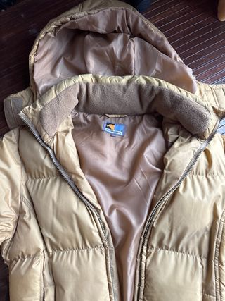 Chaqueta larga acolchada de mujer en tono beige dorado. Perfecta para mantenerte abrigada con estilo. - Diseño acolchado con compartimentos horizontales. - Cremallera frontal. - Capucha integrada. - Bolsillos laterales con cremallera.