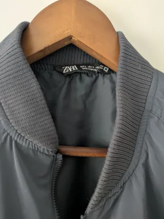 Chaqueta estilo bomber de Zara en talla L. Un básico versátil para cualquier ocasión. - Cierre de cremallera frontal. - Puños y bajo elásticos. - Bolsillos laterales.