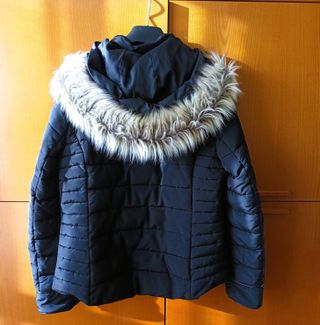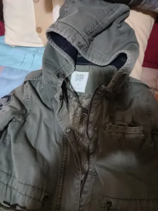 Chaqueta acolchada con estampado de camuflaje. Completamente nueva, muy poco uso. Desmontable tanto la capucha como el ribete de pelo. Tonos verdes, marrones y negros. Medidas: Hombros: 39 cm Pecho: 100 cm Largo: 61 cm Manga: 60 cm - Diseño con capucha y pelo sintético. - Cierre de cremallera frontal. - Bolsillos laterales.