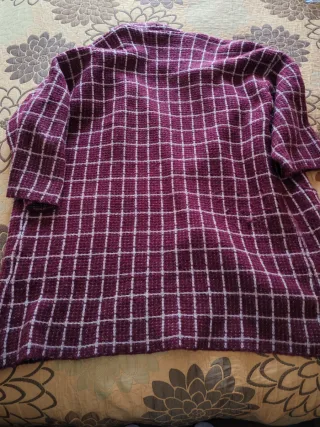 Chaqueta de punto con un diseño a cuadros en tonos burdeos y blanco roto. Es una prenda muy caliente , cómoda y versátil. - Tejido de lana. - Diseño de cuadros. - Bolsillos frontales.