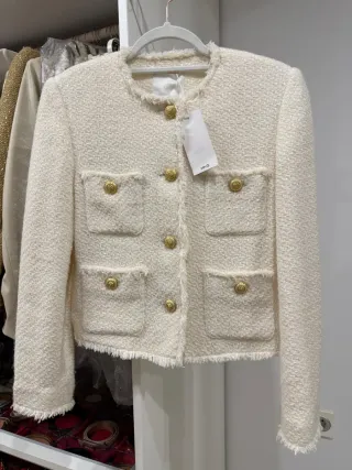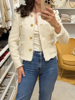 Elegante chaqueta de tweed en color crema con detalles de botones dorados. - Diseño de cuello redondo. - Acabado deshilachado en puños y bajo. - Bolsillos frontales con solapa - a estrenar