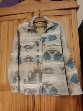 Chaqueta sobre camisa Pull and Bear con un diseño llamativo y original, talla S amplia. - Estampado geométrico y tribal. - Cierre de botones. - Bolsillos en la parte delantera.