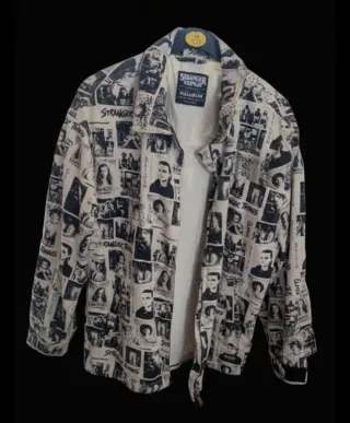 Es una chaqueta de estilo sobrecamisa (denominada a veces shacket) de una colección especial que lanzó la marca Pull&Bear en colaboración con la serie de Netflix Stranger Things. El diseño: Tiene un estampado integral tipo "collage" en blanco y negro con viñetas, escenas y personajes de la serie (se distingue claramente a Eleven/Once). La marca: En la etiqueta interior se pueden leer ambos logotipos: el de Stranger Things y el de Pull&Bear. El estilo: Es una prenda de tela vaquera o loneta rígida, diseñada para llevarse abierta sobre una camiseta o cerrada como una camisa gruesa. Cualquier duda, pide medidas.