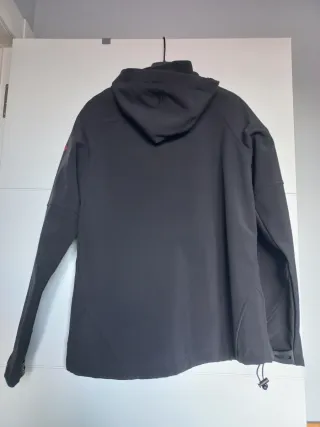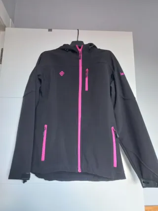 Chaqueta Izas de estilo softshell con detalles en fucsia. - Cremallera frontal. - Bolsillos con cremallera. - Capucha integrada. En perfecto estado.