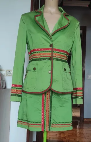 Conjunto de chaqueta y falda de la marca Rosalíta Mcgee. Presenta un diseño vibrante con detalles coloridos. -Falda: cintura 92. Cadera 102. Largo 45 -Chaqueta: hombros 42. Manga 61. Pecho 100. Cintura 90. Cadera 100. Largo 65 - Chaqueta con cuello solapa y cierre de botones. - Falda a juego con detalles decorativos. - Adornos de cintas multicolores y espejos.