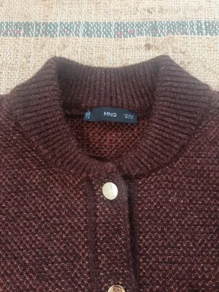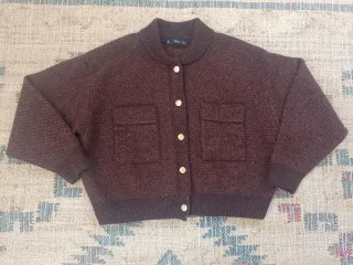 Chaqueta de punto estilo bomber color marrón talla S. - Diseño de tejido texturizado. - Cierre de botones dorados. - Dos bolsillos delanteros. - Puños y bajo de canalé.