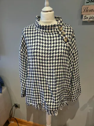 Precioso poncho-chaqueta con estampado de pata de gallo. - Diseño con cuello alto y botones. - Bajo con flecos. - Talla L.