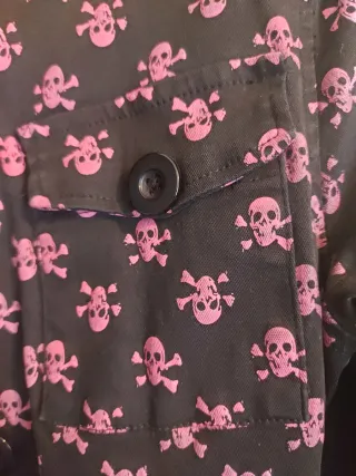Chaqueta con un llamativo estampado de calaveras rosas sobre fondo negro. - Diseño de manga larga. - Cierre frontal con botones. - Bolsillos en la parte delantera.