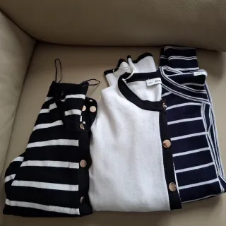 Conjunto de tres chaquetas de punto. 2 son de Zara, una talla S y otra M y otra chaqueta de Sfera talla S. - Diseño a rayas blancas y negras y azules y blancas. - Cierre con botones dorados. - Mangas largas.