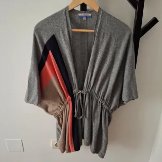 Chaqueta de punto con un diseño moderno y llamativo. - Diseño de rayas diagonales en contraste. - Cintura ajustable con cordón. - Corte tipo kimono con mangas amplias.