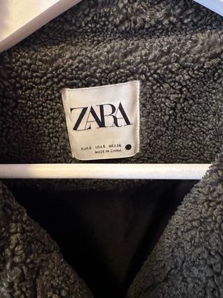 Chaqueta de Zara con un diseño moderno y cálido. - Color verde. - Forro interior de borreguito que se puede quitar. - Tiene una parte de un boton descosida pero el boton esta integro. - Capucha con pelo.