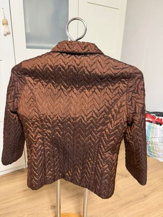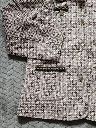Elegante chaqueta de vestir con un diseño texturizado. - Patrón geométrico con hilo dorado - Ribete decorativo en cuello y bolsillos. - Cierre frontal con botones. - Bolsillos frontales con solapa.