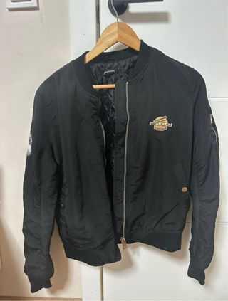 Cazadora estilo bomber de Stradivarius en color burdeos. Un básico versátil para cualquier ocasión. 38cm de sisa, con muy poco uso,como nueva. - Cierre de cremallera frontal. - Cuello y puños elásticos. - Bolsillos laterales con botón a presión. - Detalle de bolsillo con cremallera en manga.