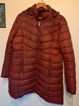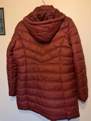 Chaqueta larga acolchada en color granate. Diseño moderno con costuras en zigzag y bolsillos con cremallera. - Capucha integrada. - Forro interior suave. - Cierre frontal de cremallera.