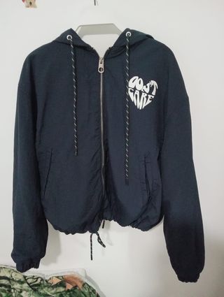 Chaqueta azul con un diseño moderno y práctico. - Capucha ajustable con cordones. - Cierre de cremallera frontal. - Puños y bajo elásticos con cordón. - Estampado blanco en forma de corazón en el pecho.