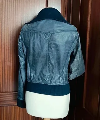 Cazadora de cuero color azul, con cuello, puños y bajos, de punto, de la marca Leather by Stradivarius. En muy buen estado, talla M. Medidas en fotos.