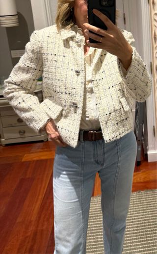 Chaqueta de tweed con un diseño elegante y moderno. - Tejido texturizado en tonos beige y multicolor. - Cierre de botones. - Bolsillos frontales con solapa.
